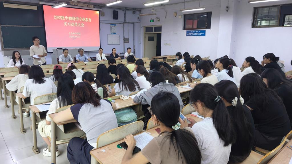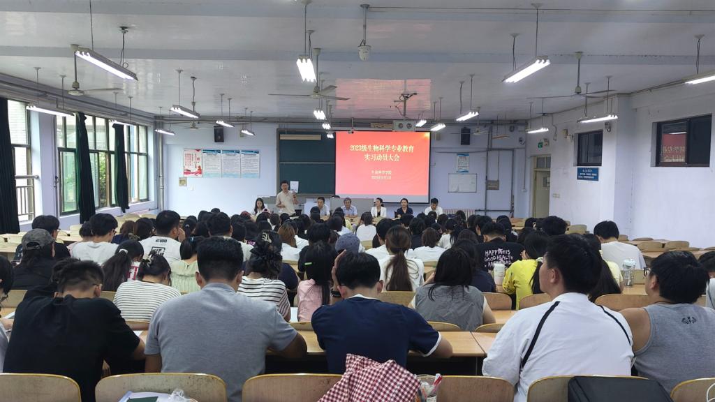 9月5日下午,BB电子游戏官网于求实楼0112教室召开2023级生物科学专业教育实习动员大会,旨在扎实推进支教实习工作,提升师范生教育实习成效。学院主要负责人、学生工作分管负责人、教学工作分管负责人、系主任、辅导员、班主任老师,以及2023级生物科学专业全体学生参加了会议。
