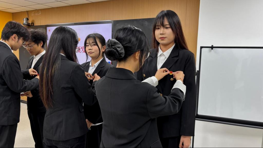 (为新发展团员佩戴团徽)