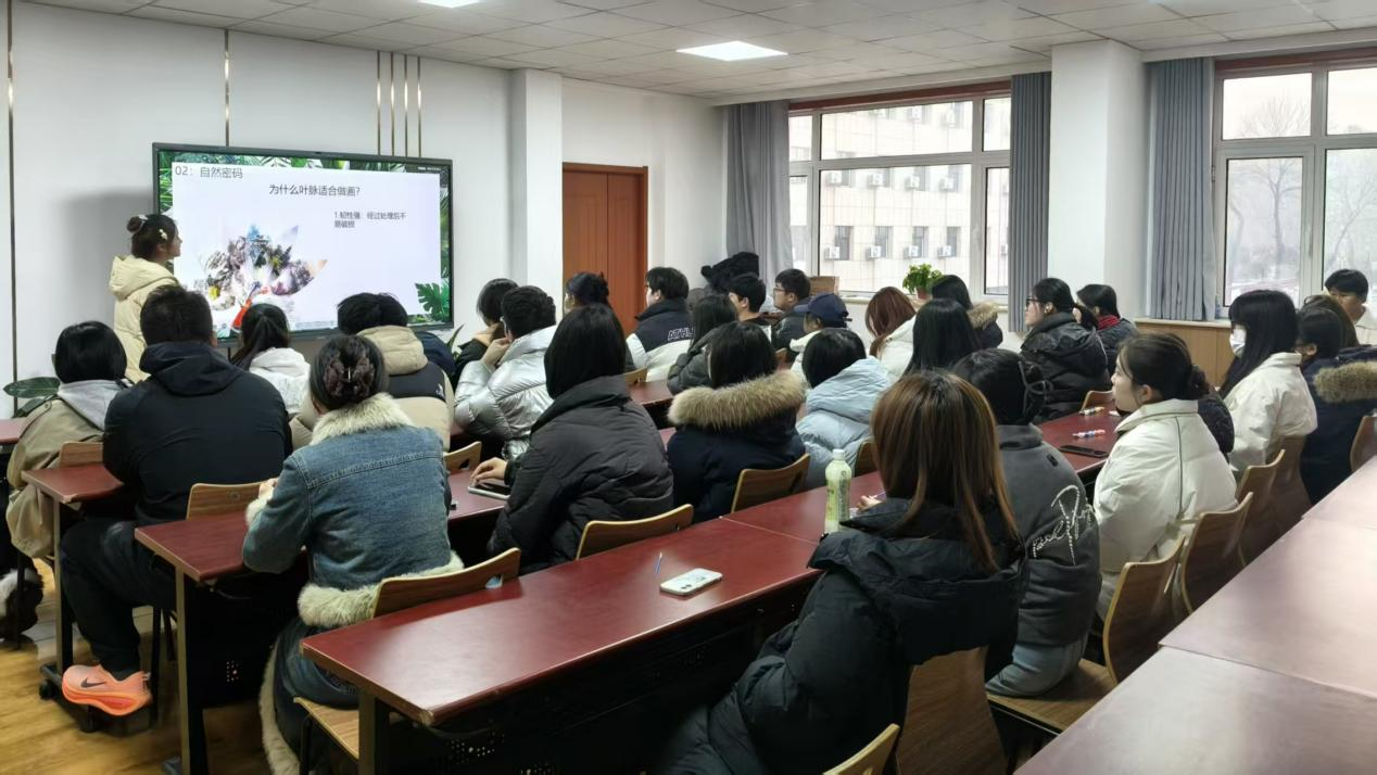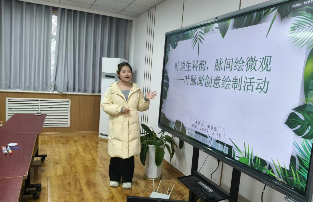 活动伊始,主讲人以“一片叶子的科学密码”为切入点,系统讲解叶脉画的起源与创作原理。从叶脉作为植物“营养运输通道”的生理结构,到不同植物叶脉的分类特征,再到叶脉画制作中“去叶肉留叶脉”的科学方法,主讲人通过实物展示与图片对比,让学子们直观理解叶脉画背后的生物学问,为后续创作奠定知识基础。在动手操作环节,同学们或参照植物细胞结构图勾勒微观世界,或结合生态主题绘制自然场景,在耐心调色与细致描绘中,将科学认知转化为生动的艺术作品。活动尾声,大家纷纷展示自己的作品,分享创作思路与收获,探讨叶脉画在生活装饰、学科实践中的多元应用。