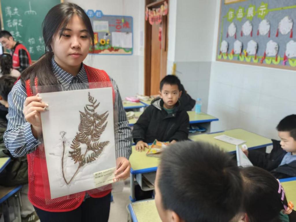 活动伊始,启承博物社的志愿者们立足生命科学专业特色,巧妙衔接小学科学课程相关内容,从生活中常见的植物入手,用浅显易懂的语言向小学生们讲解植物从藻类植物向被子植物的演化历程,生动形象地介绍每类植物的主要特征,让孩子们在轻松愉快的氛围中领略植物世界的神奇魅力。在互动环节中,孩子们踊跃发言、积极抢答问题,认真观察了多份精美的植物标本实物,近距离感受生命科学的奥秘。志愿者们还现场演示了植物标本制作的基本方法,鼓励孩子们动手实践,将理论知识转化为实际操作能力。此外,活动还巧妙融入珍爱生命、探索自然的理念,让孩子们在趣味实践中不仅掌握植物知识,更树立起对自然的敬畏与热爱。