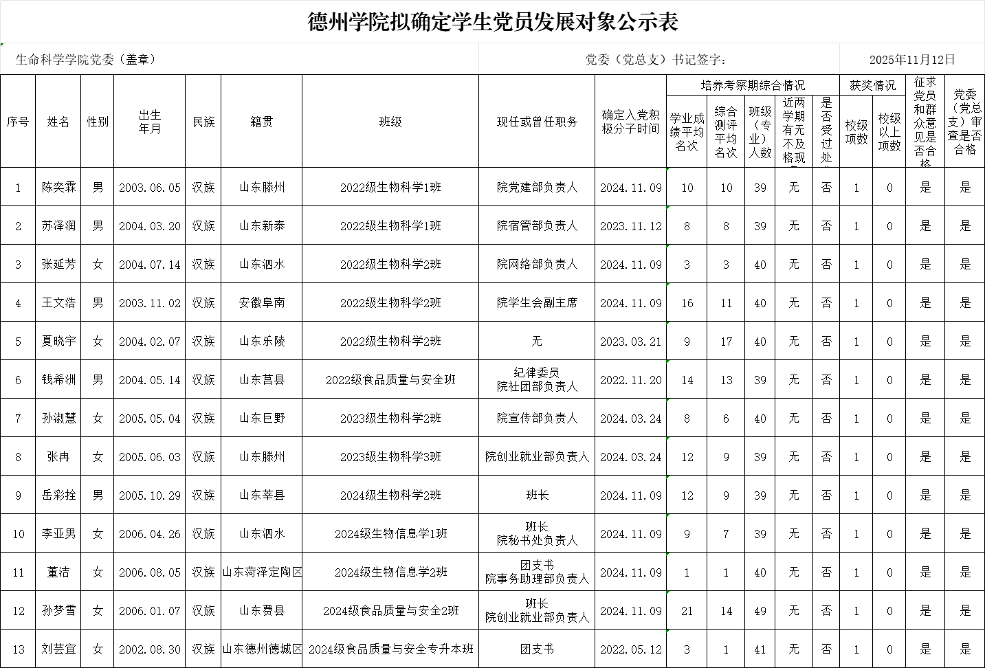 经党组织培养考察,征求党员、群众和培养联系人意见,支委会讨论研究、党委审查,拟确定陈奕霖等13人为党员发展对象。为增强发展党员工作的透明度,接受党内外群众的监督,确保发展党员的质量,根据上级文件精神和《中共BB电子游戏官网委员会发展党员工作实施细则》的要求,现将拟确定发展对象的基本情况公示如下(名单附后):