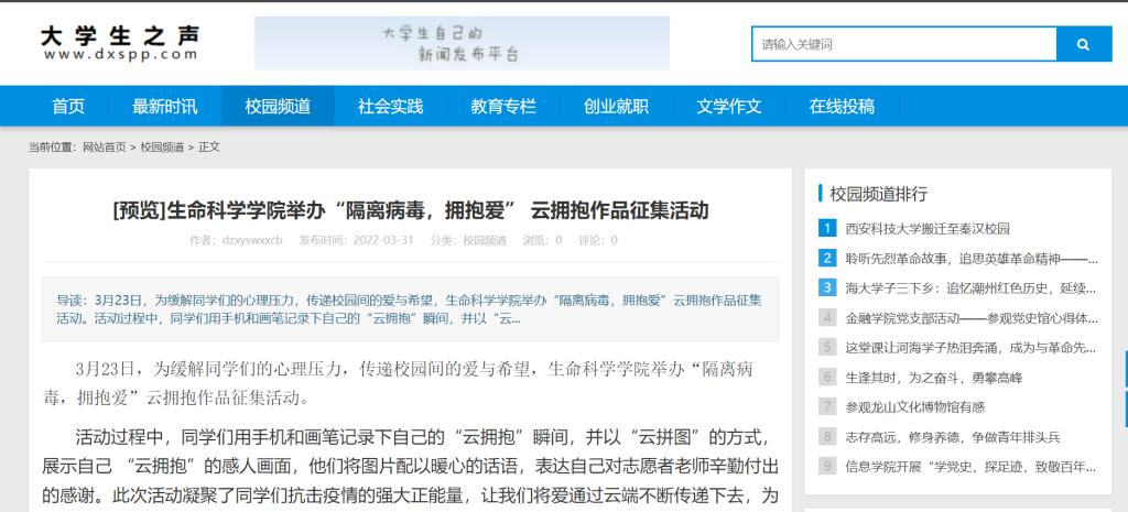 3月23日,为缓解同学们的心理压力,传递校园间的爱与希望,BB电子游戏官网举办“隔离病毒,拥抱爱”云拥抱作品征集活动。