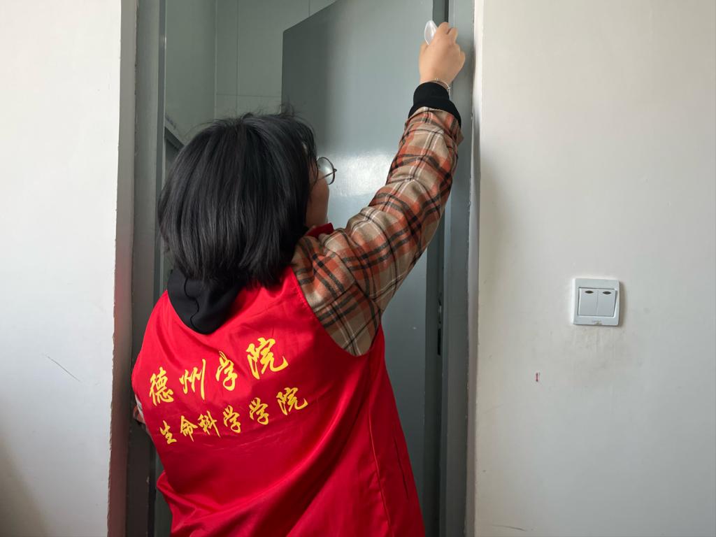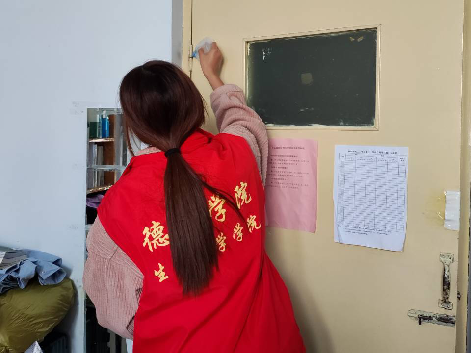 活动期间,身穿红马甲的志愿者们分别为3号、9号、10号、12号、16号、21号,26号宿舍楼的部分宿舍门或厕所门进行上门服务,她们手持润滑油,将其涂抹到门轴生锈的部位,并细心擦除溢出的部分,避免污染地面或粘在同学们的衣服上,在确定好门轴不再因卡顿出现噪音之后才离开,为同学们创造了安静、舒适的生活环境。