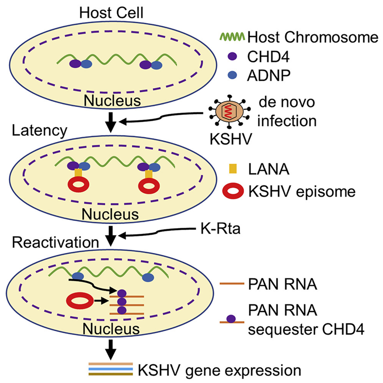 这些作者还发现,CHD4(chromodomain helicase DNA binding protein 4)与这种病毒的基因组元件结合。作为宿主细胞染色体中的一种蛋白,CHD4抑制了负责这种病毒复制的基因的工作。这项新的研究显示,CHD4是KSHV潜伏-裂解转换的一个关键调节因子。