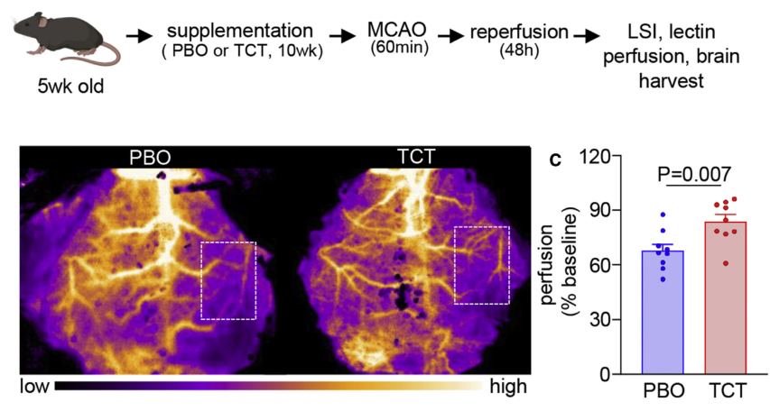 在本研究中,研究者在小鼠中,补充TCT通过诱导miR-1224改善了中风影响部位的血流灌注。对激光捕获显微解剖的中风脑部位的miRNA分析表明,miR-1224是唯一诱导的血管miR。慢病毒敲除miR-1224显著削弱了TCT对卒中预后的其他有益影响。